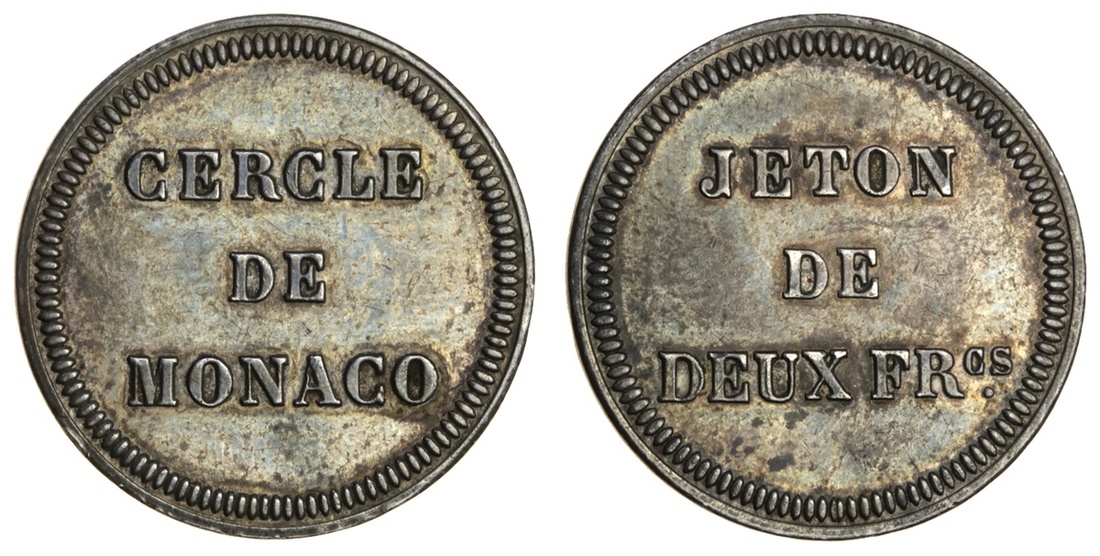 Monaco, Charles III (1853-89), silver Casino jeton cercle de monaco, rev. jeton de deux frcs, 6.94g. (MC 122b), very fine, scarce