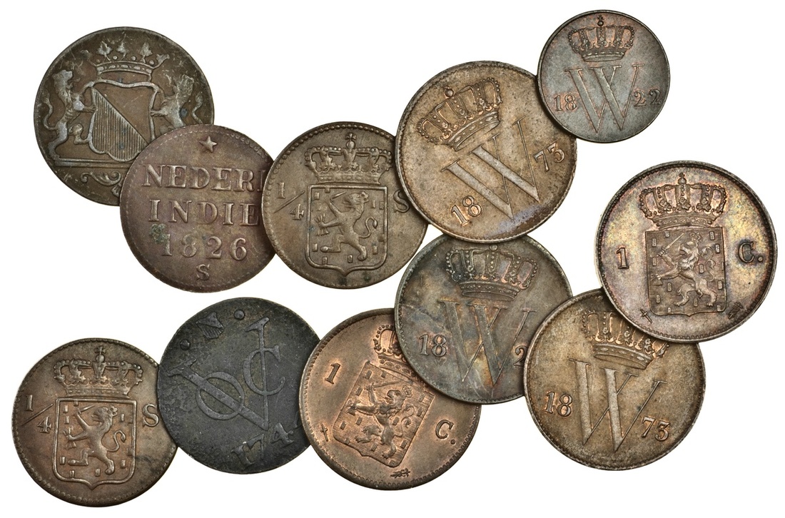 Netherlands, William I (1815-40), Cent, 1823, Half-Cent, 1822, both Utrecht (KM 47, 51), William III (1849-90), Cent (4), 1863, 1873 (3), all m.m. sword (KM 100), Netherlands East Indies, copper Doits (2), of Utrecht, 1744, 1794 (Scholten 290 - RR and 320), and 1/4-Stuiver (3), all 1826S (KM 287), these very fine, the Kingdom coins good very fine to extremely fine with traces of lustre (11)