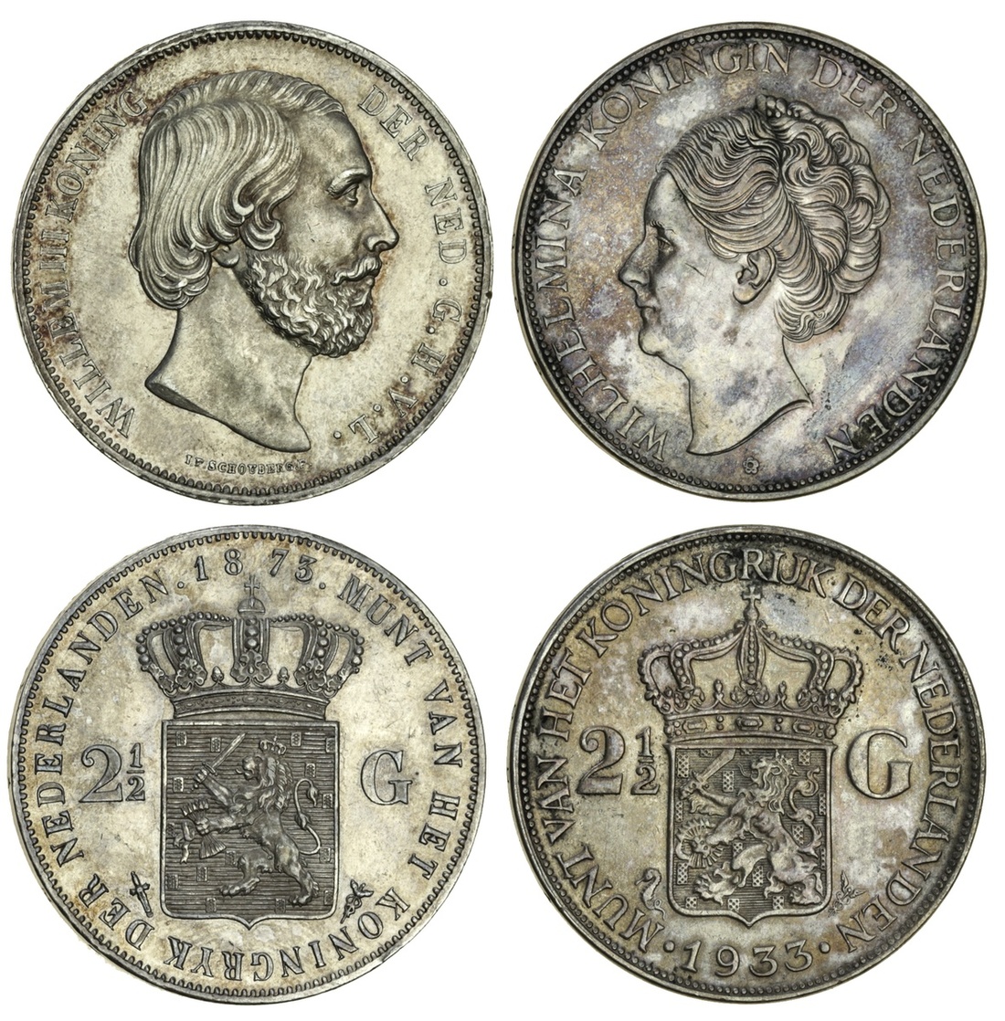 Netherlands, William III (1949-90), 2½-Gulden, 1873, Wilhelmina I, (1890-1948), 2½-Gulden, 1933 (KM.82, 165), the second with cut on queen's cheek, both extremely fine (2)