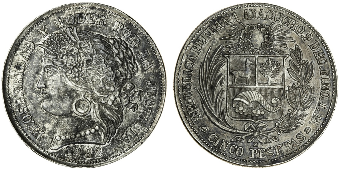Peru, 5-Pesetas, 1882 LM, Ayacucho, head left, rev. shield (KM 201.3), good very fine