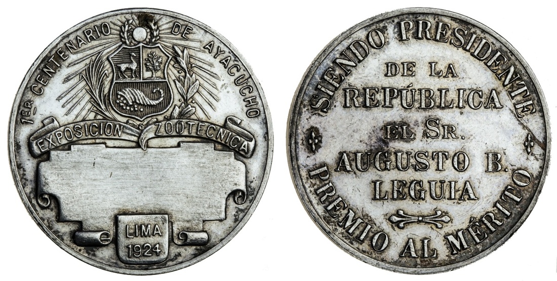 Peru, silver prize medal, Exhibition in celebration of the first centennary of the Battle of Ayacucho, 1924, Exposicio Zootecnica, arms of Peru above (unnamed) cartouche, rev. siendo presidente de la república el sr augusto b leguia - premio al mérito , 29.7mm., extremely fine