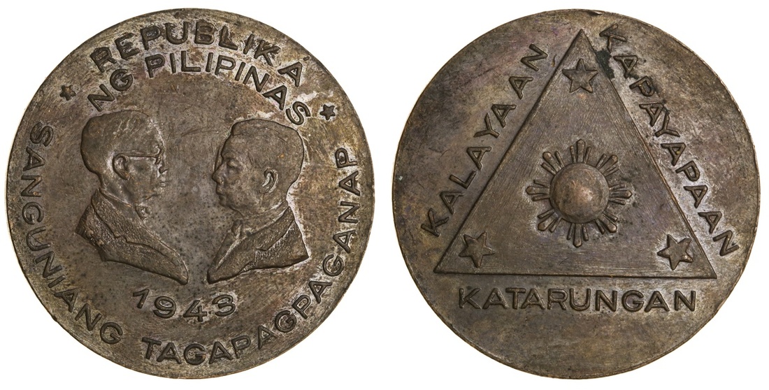 Philippines, Japanese Occupation, bronze medals by Crispulo Zamora (2), Jose Paciano Laurel, bust left, signed cz on shoulder, rev. flag, 3mm. thick flan, 44mm. diam, and busts of Laurel and Benigno Aquino (?), signed cz on shoulder, 44mm. diam, 4mm. thick flan, the first with die polishing lines clear on both sides, both slightly crude but about as struck (2)