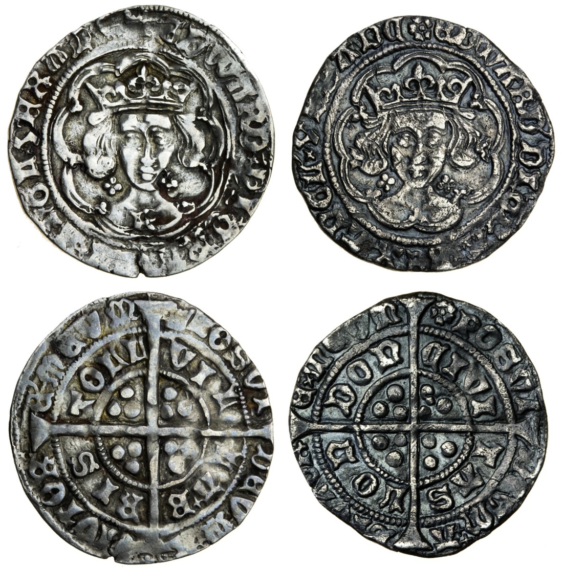 Edward IV, first reign (1461-70), Groats (2), light coinage, London, 2.85g, m.m. rose, facing bust, quatrefoils at neck, rev. long cross and pellets, extra pellet in one corner (N.1568; S.2000), Bristol, 3.13g, m.m. crown, similar, b on breast, rev. long cross and pellets (N.1580; S.2004), both good fine, the first better (2)