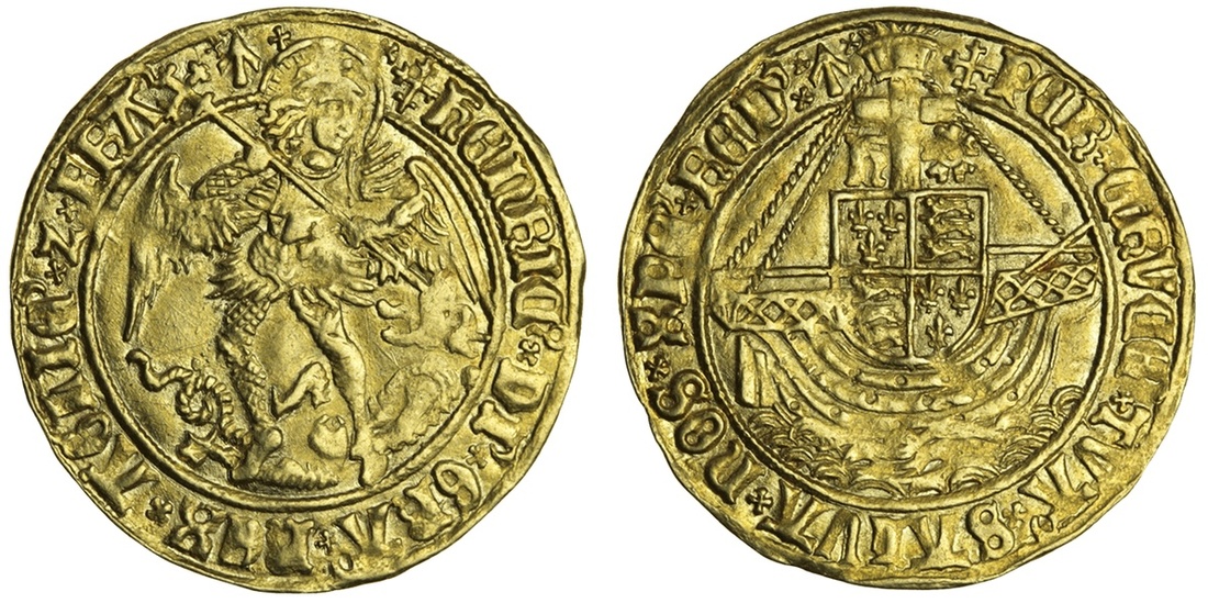 Henry VII (1485-1509), Angel, class V, m.m. crosslet, 5.16g, St. Michael slaying dragon, rev. ship and square topped shield, mast dividing h and rose (N.1698; Schneider 542-4; S.2187), very fine, a pleasing central strike on a round flan