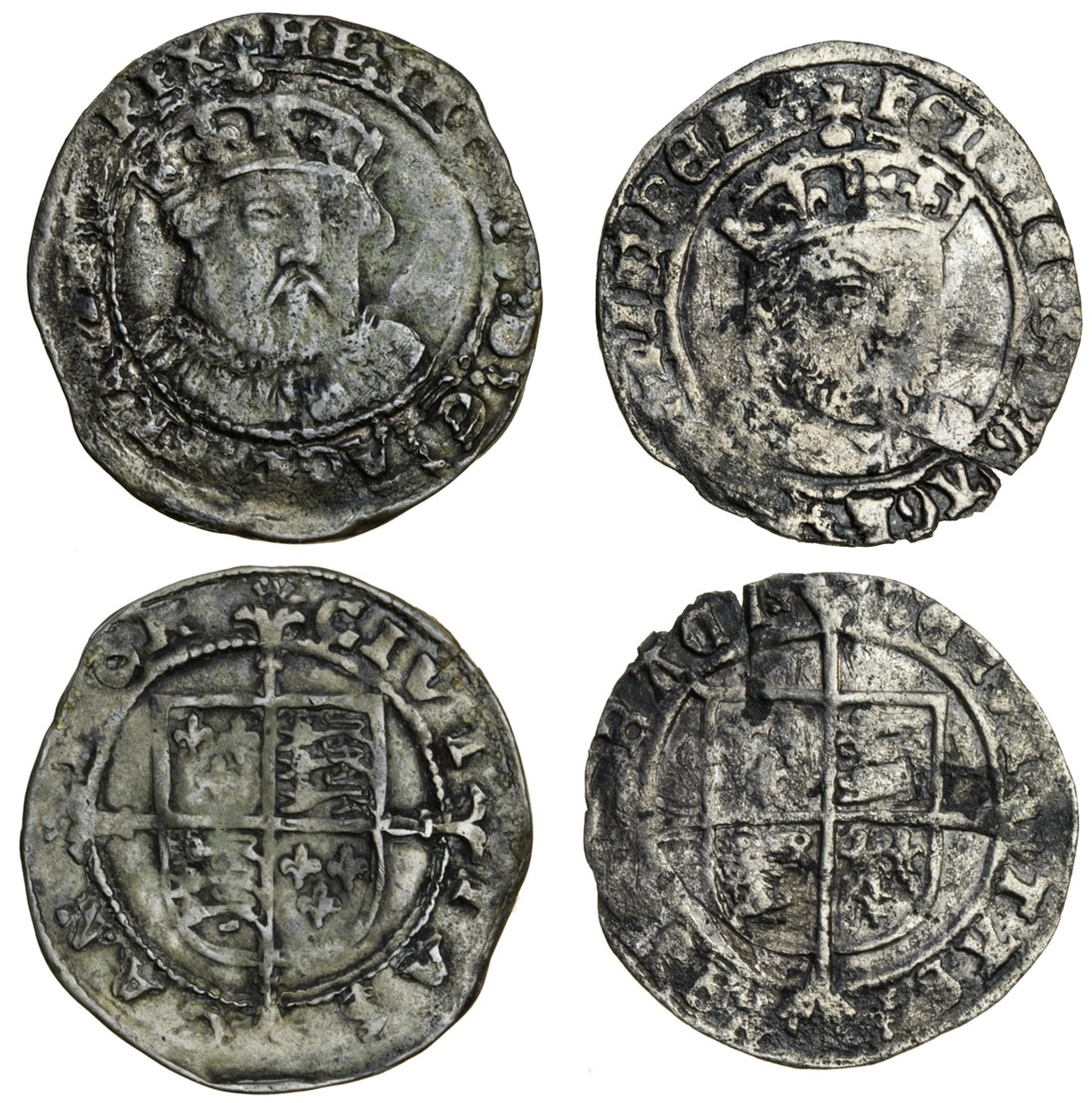 Henry VIII (1509-47), Groats (2), third coinage, Canterbury, 2.44g, no m.m., bust 2 three-quarters right, rev. shield over long cross fourchée, half rosette in forks (N.1847; S.2373), third coinage, York, 2.13g, bust 3 three-quarters right, rev. similar (N.1848; S.2374), the first good fine, the second fine with some dark spots (2)
