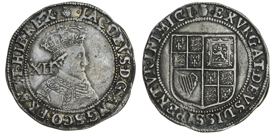 James I (1603-25), Shilling, first coinage 1603-4, 6.02g, m.m. thistle, second bust right, value behind, rev. square-topped shield (N.2073; S.2646), die flaw across ear, dark tone, about very fine