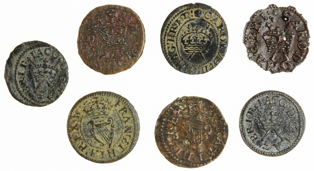 James I (1603-25), Farthings (2), Harington type 2, m.m. cinquefoil, 0.73g (S.2676), Harington type 3, m.m. martlet, 0.48g, large crown and harp (S.2676A), Charles I (1625-49), Farthings (4), Richmond type 2, 0.48g (S.3183), Richmond type 6, m.m. rose, 0.37g (S.3187), Maltravers type 2, m.m. rose, 0.57g (S.3198), Maltravers type 3, m.m. woolpack/portcullis, 0.48g (S.3199), additionally, contemporary counterfeit of Richmond type 2, 0.81g (S.3183B), fine to very fine (7)