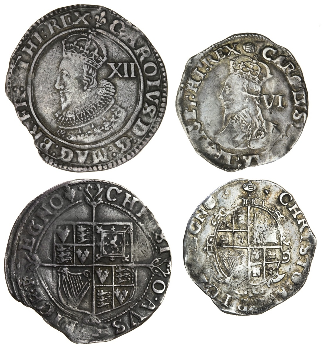 Charles I (1625-49), Shilling, group A, 5.39g, m.m. lis, second bust left, value behind, rev. square-topped shield over cross fourchée (N.2216; S.2782), Sixpence, group D, 3.19g, m.m. tun, fourth bust 3a left, value behind, rev. oval garnished shield, no inner circles (N.2241; S.2813), the first short of flan, otherwise both about very fine (2)