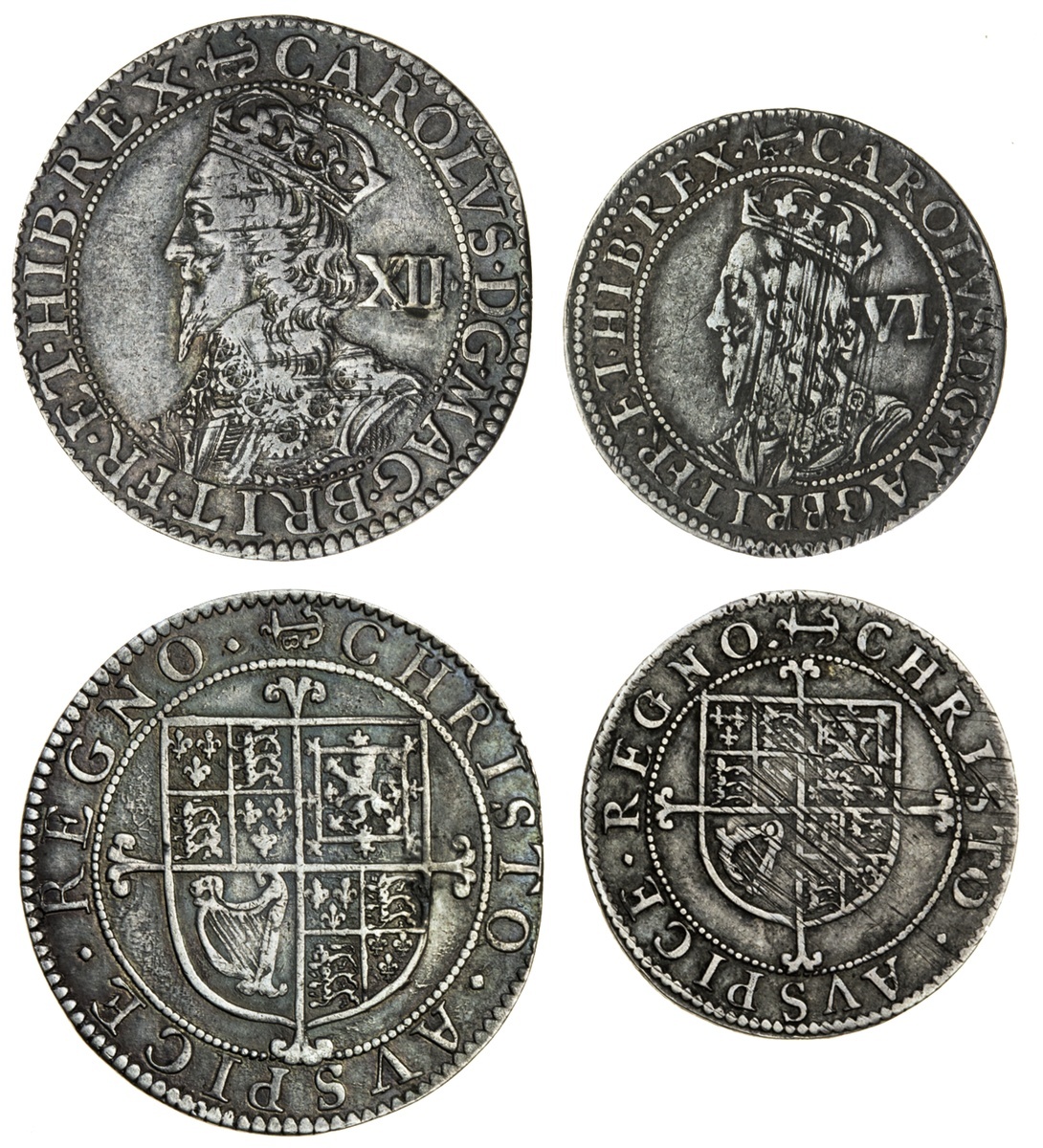 Charles I (1625-49), Shilling, Briot's second milled issue, 6.03g, m.m. anchor and B, Briot's late bust left, value behind, rev. square-topped shield over cross fourchée (N.2305; S.2859), Sixpence, 3.00g, similar (N.2306; S.2860), both with adjustment marks to bust, otherwise both almost very fine (2)