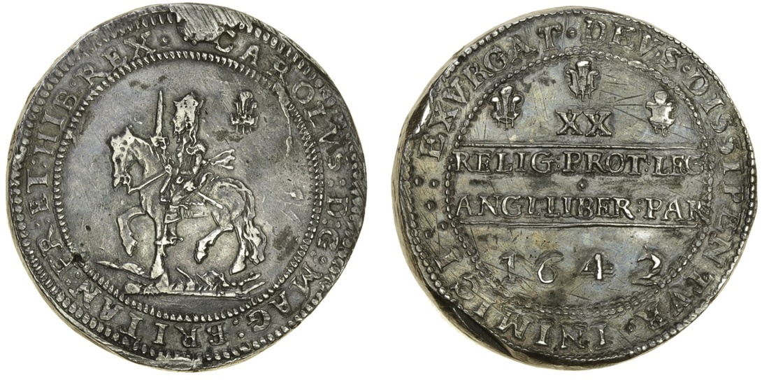 Charles I (1625-49), Pound, 1642, Civil War issue, Shrewsbury, 119.65g, m.m. four pellets, carolvs: d: g: mag: britan: fr: et: hib: rex, Shrewsbury horseman left trampling on arms, plume behind, no cannon, exergual line, rev. exurgat devs dissipentvr inimici, declaration in two lines, relig. prot. leg. ang. liber. par., three Oxford plumes and mark of value .x x. above, date below (Brooker 803/796, same dies; Morrison D/4; N.2362; S.2939), typical die flaws on obverse at 12 and 6 o'clock, scratches to reverse and a test cut to edge, otherwise very fine and rare