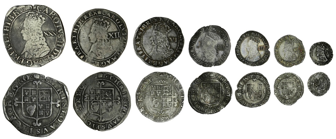 Charles II (1660-85), third hammered issue, Halfcrown to Penny (7), Halfcrown, 14.56g, m.m. crown, crowned bust left, value behind, rev. square-topped shield over cross fourchée, Shilling, 5.55g, similar, Sixpence, 3.19g, similar, Fourpence, 1.88g, similar, Threepence, 1.50g, similar, Twopence, 0.97g, similar, Penny, 0.51g, similar (N.2761; 2764; 2768; 2769; 2772; 2775; S.3321-27), generally fine, several very fine (7)