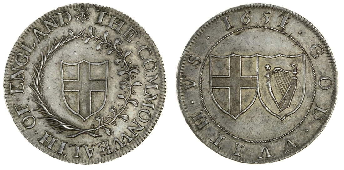 Commonwealth (1649-60), pattern Halfcrown, 13.13g, 1651, 32mm., .m. sun, Unattributed, but presumably by Blondeau or Ramage, the. commonwealth. of. england, shield of England within palm and laurel wreath rev. coin alignment, god. vvith. vs., conjoined shields of England and Ireland, no mark of value, edge plain (ESC 68 {445D} [R7], this coin; N.-; S.-), light toning over lustrous, original surfaces, good extremely fine, the only recorded specimen