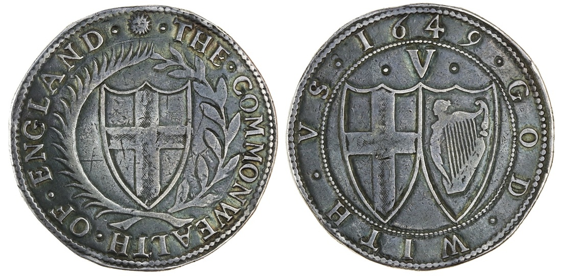 Commonwealth (1649-60), Crown, 29.41g, 1649, m.m. sun, shield of England within palm and laurel wreath, thin wire-line inner circle, rev. conjoined shields of England and Ireland, mark of value above (ESC 2 {2} [R5], this coin; N.2721; S.3214), almost very fine with dark toning, extremely rare