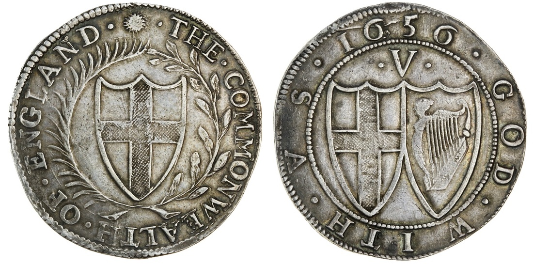 Commonwealth (1649-60), Crown, 29.92g, 1656 large 6, m.m. sun, shield of England within palm and laurel wreath, rev. inverted a for v in vs, conjoined shields of England and Ireland, mark of value above (ESC 10 {8} [R2], this coin; N.2721; S.3214), very fine, rare