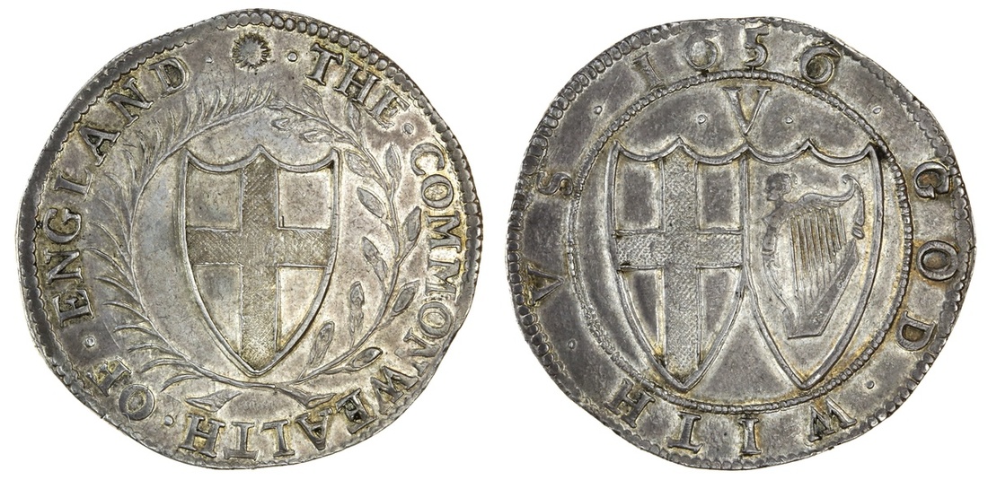 Commonwealth (1649-60), Crown, 30.05g, 1656 over small 6 over 4, m.m. sun, shield of England within palm and laurel wreath, rev. inverted a for v in vs, conjoined shields of England and Ireland, mark of value above (ESC 14 {8A} [R3]; N.2721; S.3214), good extremely fine and lustrous