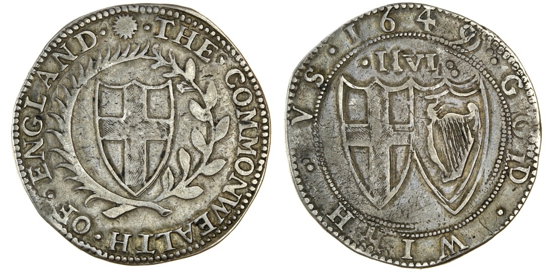 Commonwealth (1649-60), Halfcrown, 14.62g, 1649, m.m. sun, shield of England within palm and laurel wreath, rev. conjoined shields of England and Ireland, mark of value above, thin wire-line inner circle (ESC 16 {425} [R3], this coin; N.2722; S.3215), slightly double struck, otherwise good fine and rare