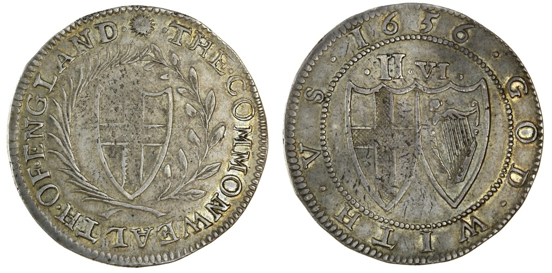 Commonwealth (1649-60), Halfcrown, 14.91g, 1656, m.m. sun, shield of England within palm and laurel wreath, rev. coin alignment, conjoined shields of England and Ireland, mark of value above (ESC 49 {437}; N.2722; S.3215), an exceptionally round and well-struck example, very fine and rare