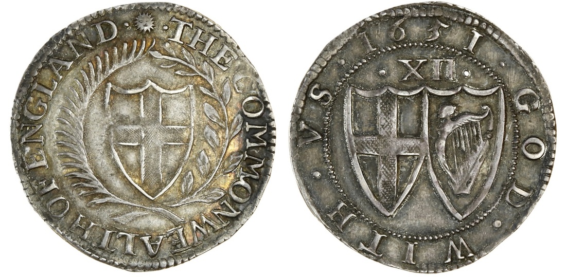 Commonwealth (1649-60), Shilling, 6.07g, 1651, m.m. sun, shield of England within palm and laurel wreath, only stops at mintmark, rev. conjoined shields of England and Ireland, mark of value above (ESC 92 {984A} [R2]; N.2724; S.3217), attractive tone, good very fine, round even strike