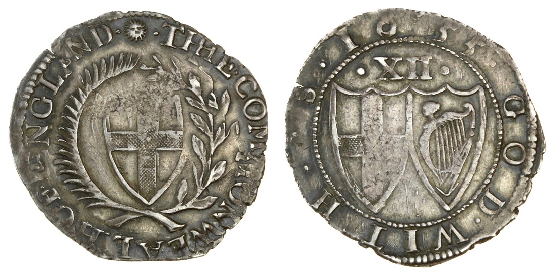 Commonwealth (1649-60), Shilling, 5.96g, 1655, m.m. sun, shield of England within palm and laurel wreath, rev. conjoined shields of England and Ireland, mark of value above (ESC 145 {993}; N.2724; S.3217), double-struck, otherwise very fine