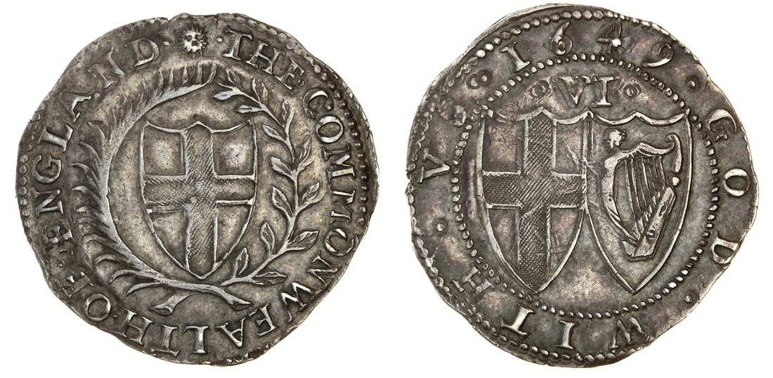 Commonwealth (1649-60), Sixpence, 2.92g, 1649, m.m. sun, shield of England within palm and laurel wreath, rev. conjoined shields of England and Ireland, mark of value above (ESC 177 {1483}; N.2726; S.3219), slightly double-struck, attractive old tone, about extremely fine, rare thus