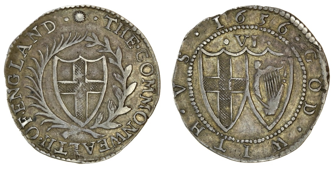 Commonwealth (1649-60), Sixpence, 3.01g, 1656, m.m. sun, shield of England within palm and laurel wreath, rev. conjoined shields of England and Ireland, mark of value above (ESC 204 {1492}; N.2726; S.3219), very fine
