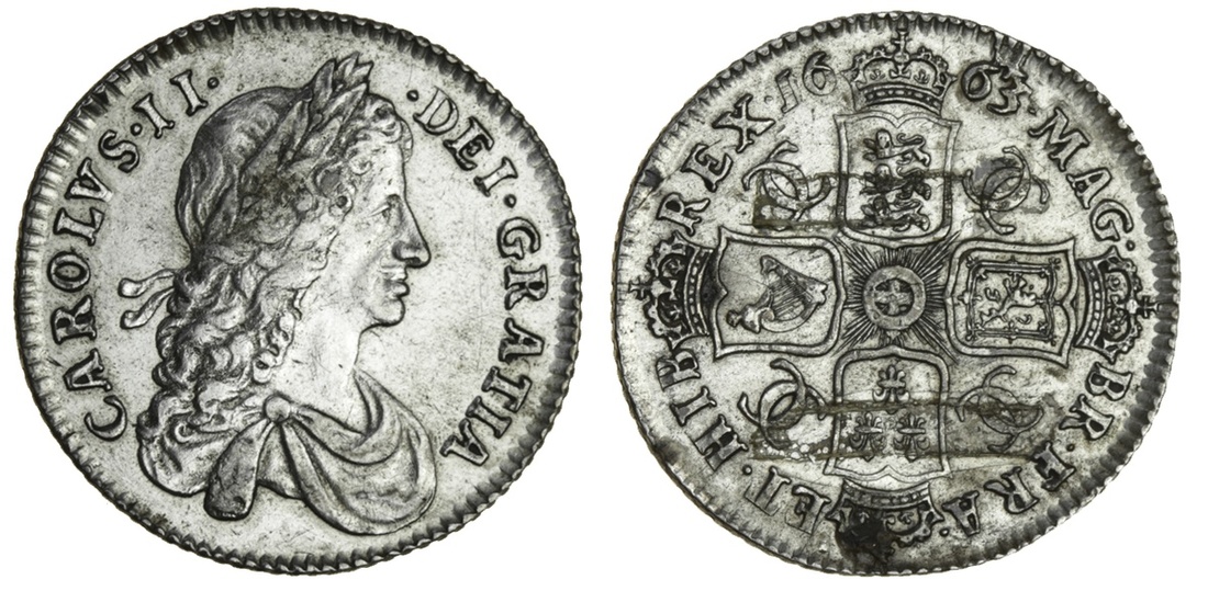Charles II (1660-85), Shilling, 1663, first laureate and draped bust right, rev. crowned shields cruciform (ESC 500; S.3371), adhesive residue on reverse, very fine