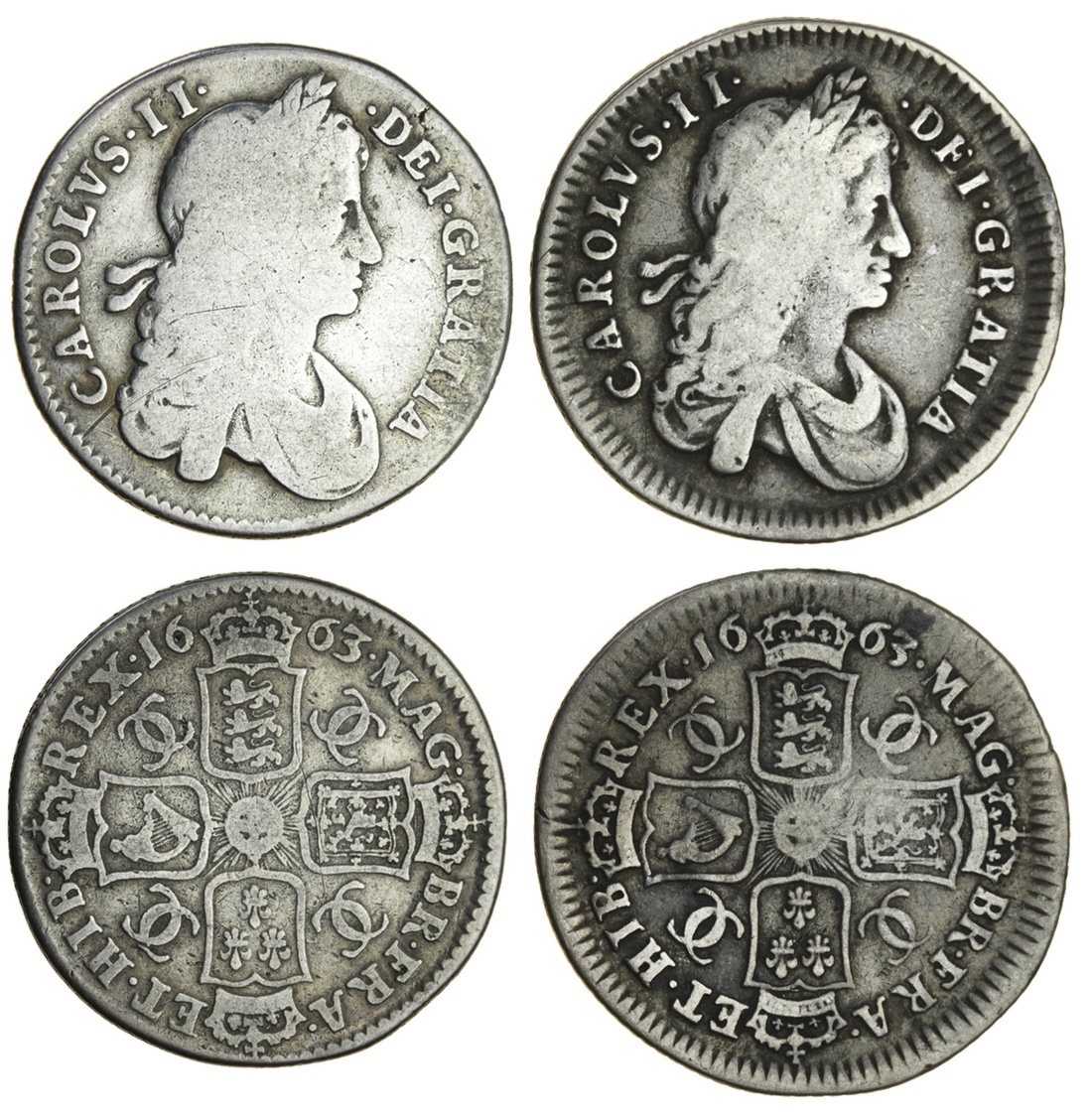 Charles II (1660-85), Shillings, 1663 (2), first laureate and draped bust right, rev. crowned shields cruciform (ESC 500; S.3371), one near fine, the second better, toned (2)