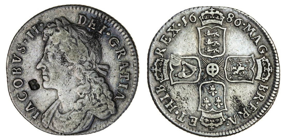 James II (1685-88), Shilling, 1686, laureate and draped bust left, rev. crowned shields cruciform (ESC 765; S.3410), countermark before chin, otherwise good fine, the reverse better