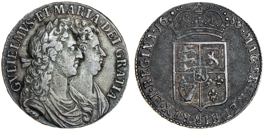 William and Mary (1689-94), Halfcrown, 1689 primo, first draped busts right, rev. first crowned shield, caul only frosted with pearls (ESC 831; S.3434), near very fine, dark toning