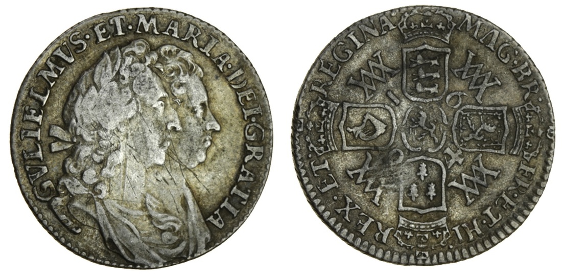 William and Mary (1989-94), Sixpence, 1694, conjoined busts right, rev. crowned shields cruciform, wm monogram in angles (ESC 871; S.3438), weak strike on obverse, good fine