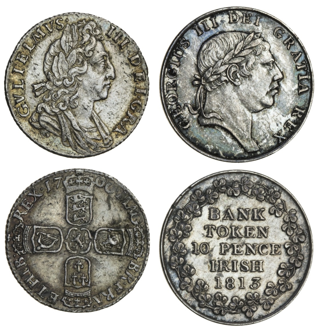 William III (1694-1702), Sixpence, 1700, third laureate and draped bust right, rev. crowned shields cruciform (ESC 1250; S.3538); George III (1760-1820), Ireland, Bank Token, Ten Pence, 1813, laureate head right, rev. inscription in wreath (S.6618), the second cleaned, very fine, the first better (2)