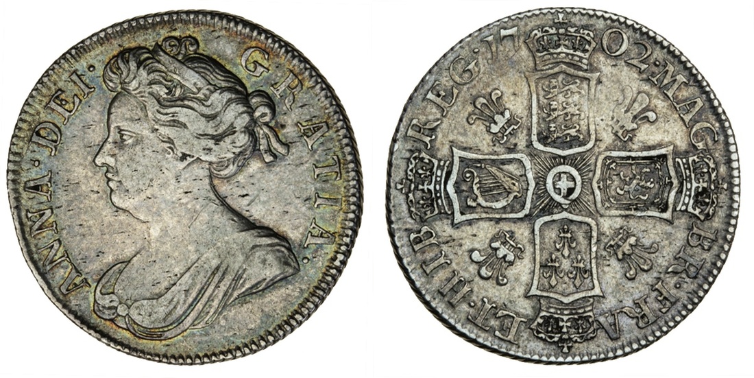 Anne (1702-14), Shilling, 1702, first draped bust left, rev. crowned shields cruciform, plumes in angles (ESC 1386; S.3584), toning in recesses, very fine, scarce