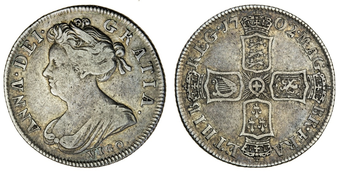 Anne (1702-14), Shilling, 1702, first draped bust left, vigo below, rev. crowned shields cruciform (ESC 1387; S.3585), good fine