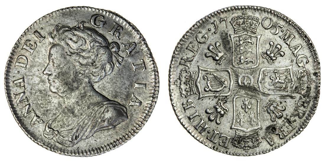 Anne (1702-14), Shilling, 1705, second draped bust left, rev. crowned shields cruciform, plumes in angles (ESC 1392; S.3588), surfaces marks to reverse, otherwise good very fine