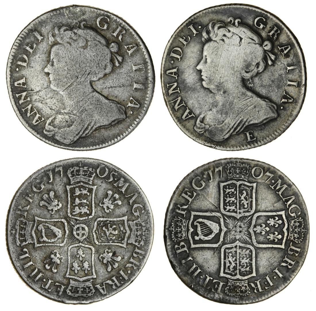 Anne (1702-14), Shillings (2), 1705, second draped bust left, rev. crowned shields cruciform, plumes in angles (ESC 1392 [R2]; S.3588); after Union, 1707, Edinburgh, as last, e below bust, rev. as last, angles plain (ESC 1414; S.3608), the first with a light mount mark, both about fine (2)