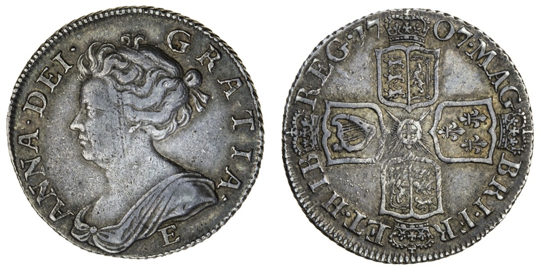 Anne (1702-14), Shilling, 1707, post-Union, Edinburgh, second draped bust left, e below, rev. crowned shields cruciform, angles plain (ESC 1414; S.3608), light adjustment marks to reverse, otherwise very fine