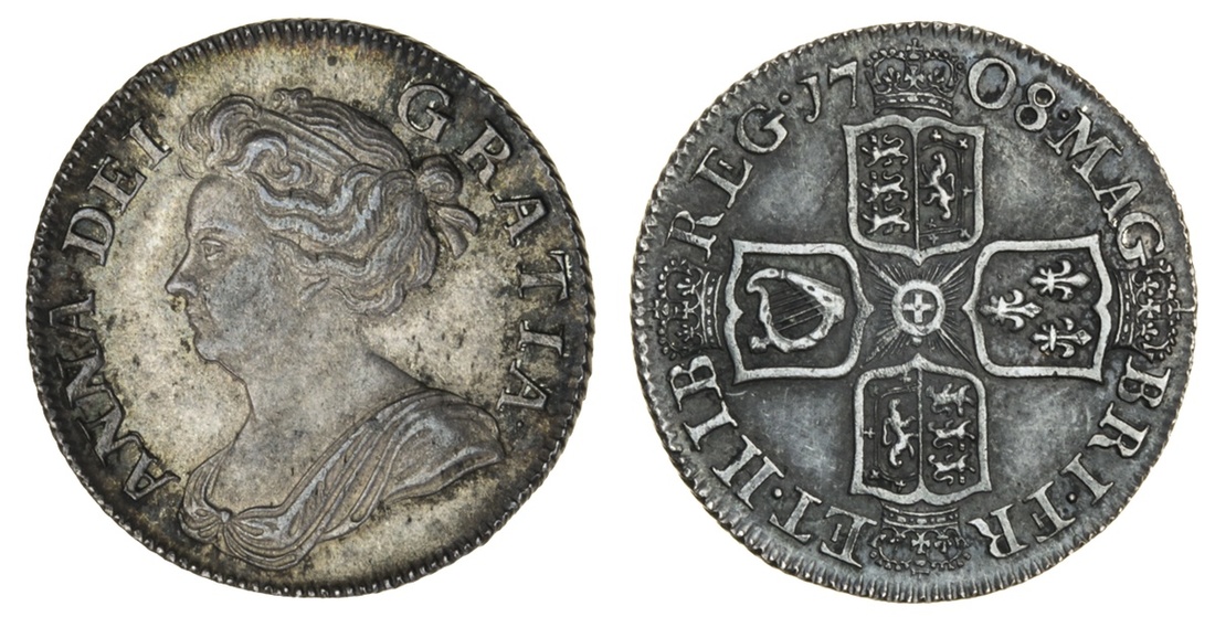 Anne (1702-14), Shilling, 1708, second draped bust left, rev. crowned shields cruciform, angles plain (ESC 1399; S.3610), about extremely fine, dark toning over lustrous original surfaces
