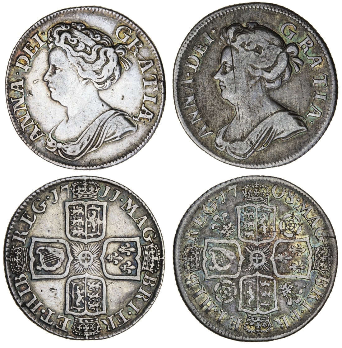 Anne (1702-14), Shillings (2), 1708, third draped bust left, rev. crowned shields cruciform, roses and plumes in angles (ESC 1401; S.3614); another, 1711, fourth draped bust left, rev. similar, angles plain (ESC 1408; S.3618), the first with mark across bust, fine and toned, the second better (2)