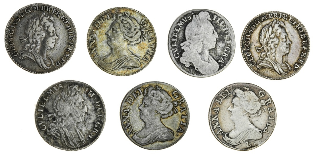 William III (1694-1702), Sixpences (2), 1696, first laureate and draped bust right, rev. crowned shields cruciform (ESC 1202; S.3520); 1697, third bust, as last (ESC 1233; S.3538); Anne (1702-14), Sixpences (3), 1708, after Union, Edinburgh, draped bust left, E* below, rev. as last (ESC 1469; S.3621); 1711 (2), as last, nothing below bust (ESC 1460; S.3619); George I (1714-27), Sixpences, 1723 (2), laureate and draped bust right, rev. as last, SSC in angles (ESC 1612; S.3652), near fine to very fine (7)