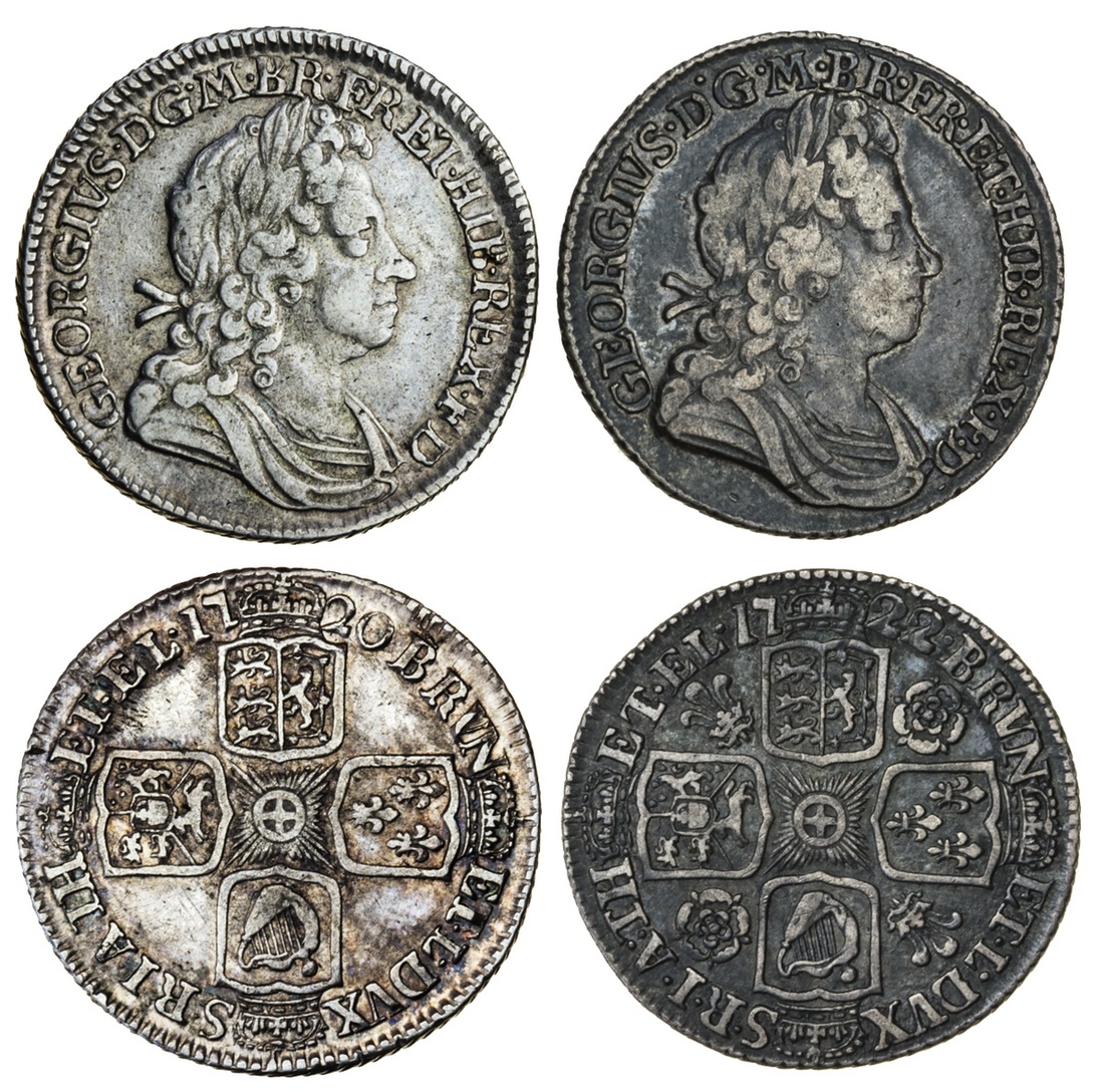 George I (1714-27), Shillings (2), 1720, first laureate and draped bust right, rev. crowned shields cruciform, angles plain (ESC 1573; S.3646); 1722, similar, rev. similar, roses and plumes in angles (ESC 1581; S.3645), the second fine, the first better (2)