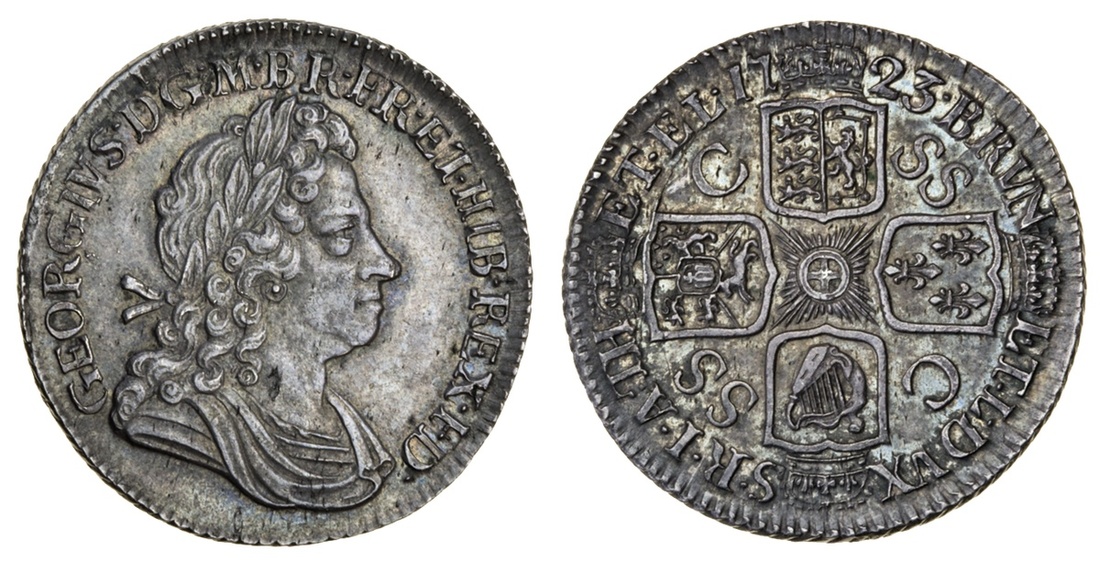 George I (1714-27), Shilling, 1723, first laureate and draped bust right, rev. crowned shields cruciform, SSC in angles (ESC 1586; S.3647), cabinet toning, good extremely fine and toned