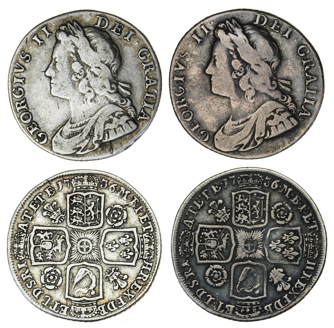 George II (1727-60), Shillings (2), 1736, young laureate and draped bust left, rev. crowned shields cruciform, roses and plumes in angles (ESC 1709; S.3700); 1736 over 5, similar (ESC 1710; S.3700), both fine (2)
