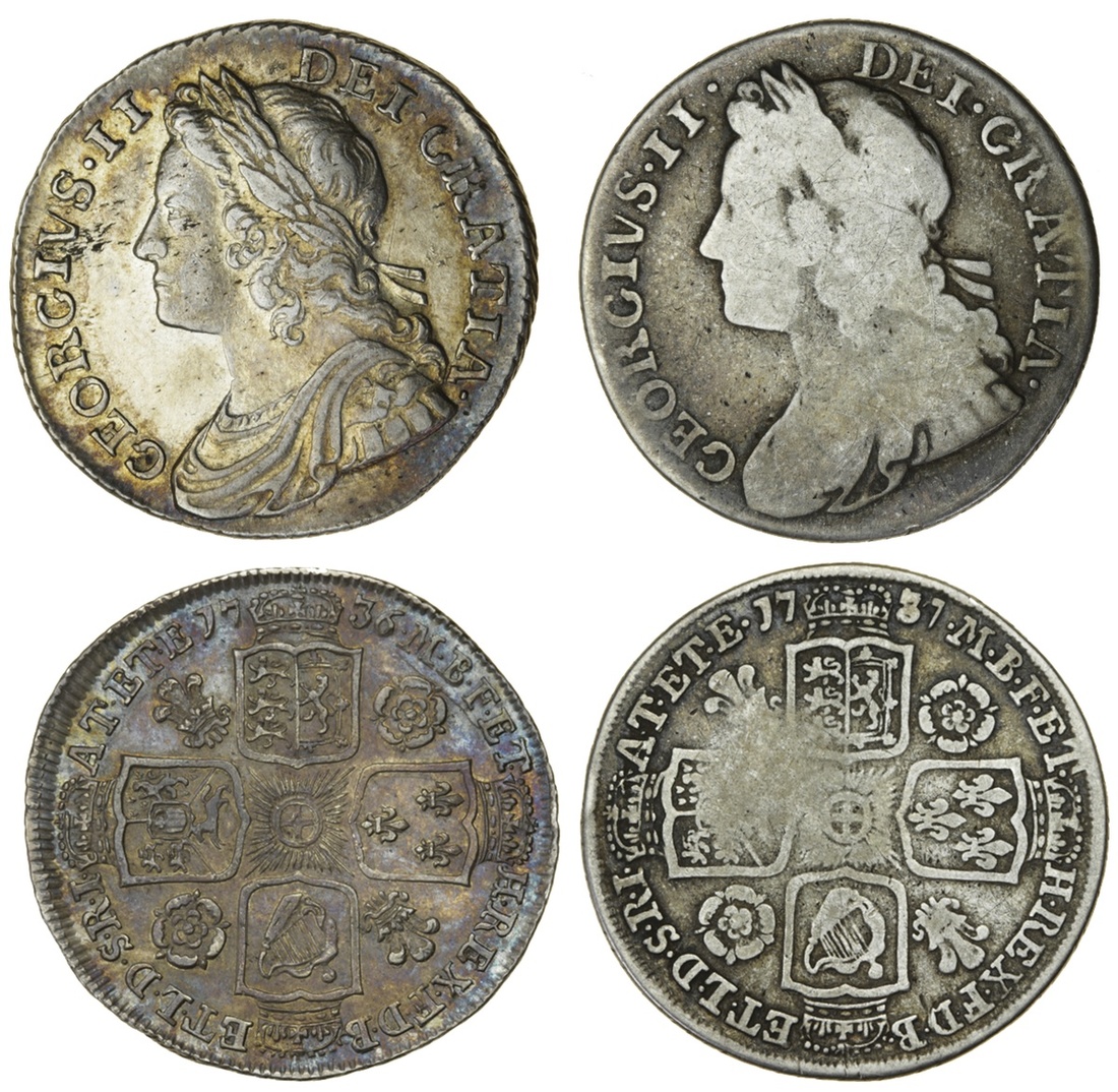 George II (1727-60), Shillings (2), 1736, young laureate and draped bust left, rev. crowned shields cruciform, roses and plumes in angles (ESC 1709), 1737, similar (ESC 1711; S.3700), the second fine, blocked die in date, the first good very fine and toned (2)