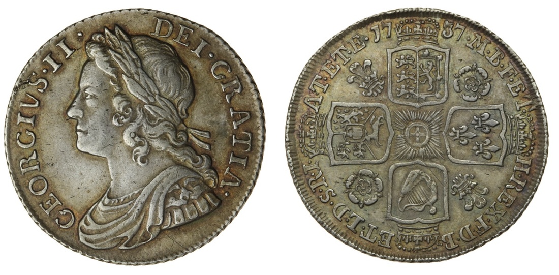 George II (1727-60), Shilling, 1737, the 3 clogged and repunched, young, laureate, draped and cuirassed bust left, rev. four crowned shields cruciform, roses and plumes in angles (S.3700), old tone, very fine