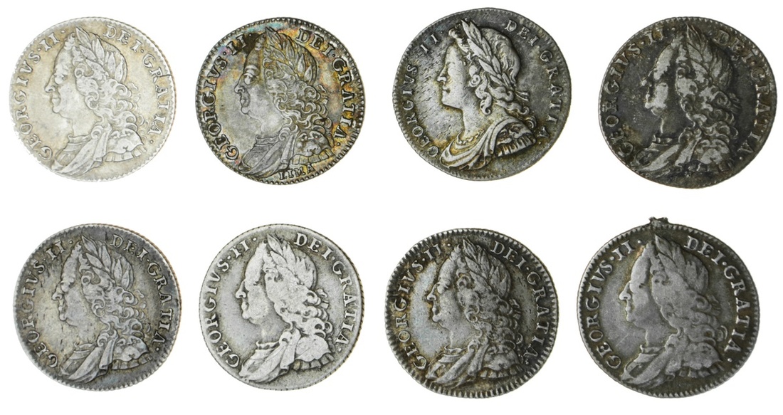 George II (1727-60), Sixpences (8), 1728, young laureate and draped bust left, rev. crowned shields cruciform, roses and plumes in angles (ESC 1740; S.3707); 1746, old laureate and draped bust left, lima below, rev. similar, angles plain (ESC 1757; S.3710A); 1757 (5), as last, nothing below bust; 1758, similar (ESC 1762, 1763; S.3711), fine to extremely fine, one 1757 removed from mount (8)