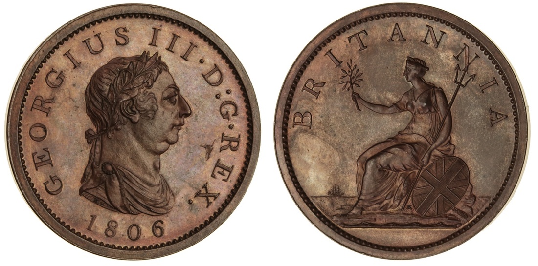 George III (1760-1820), fourth issue, restrike proof Penny, 1806, laureate bust right, without hair curl to right of tie-knot, rev. Britannia, ship without gunports, plain edge, bronzed (Peck 1350), small metal flaw on obverse, otherwise uncirculated, attractive light red brown colour with lustre