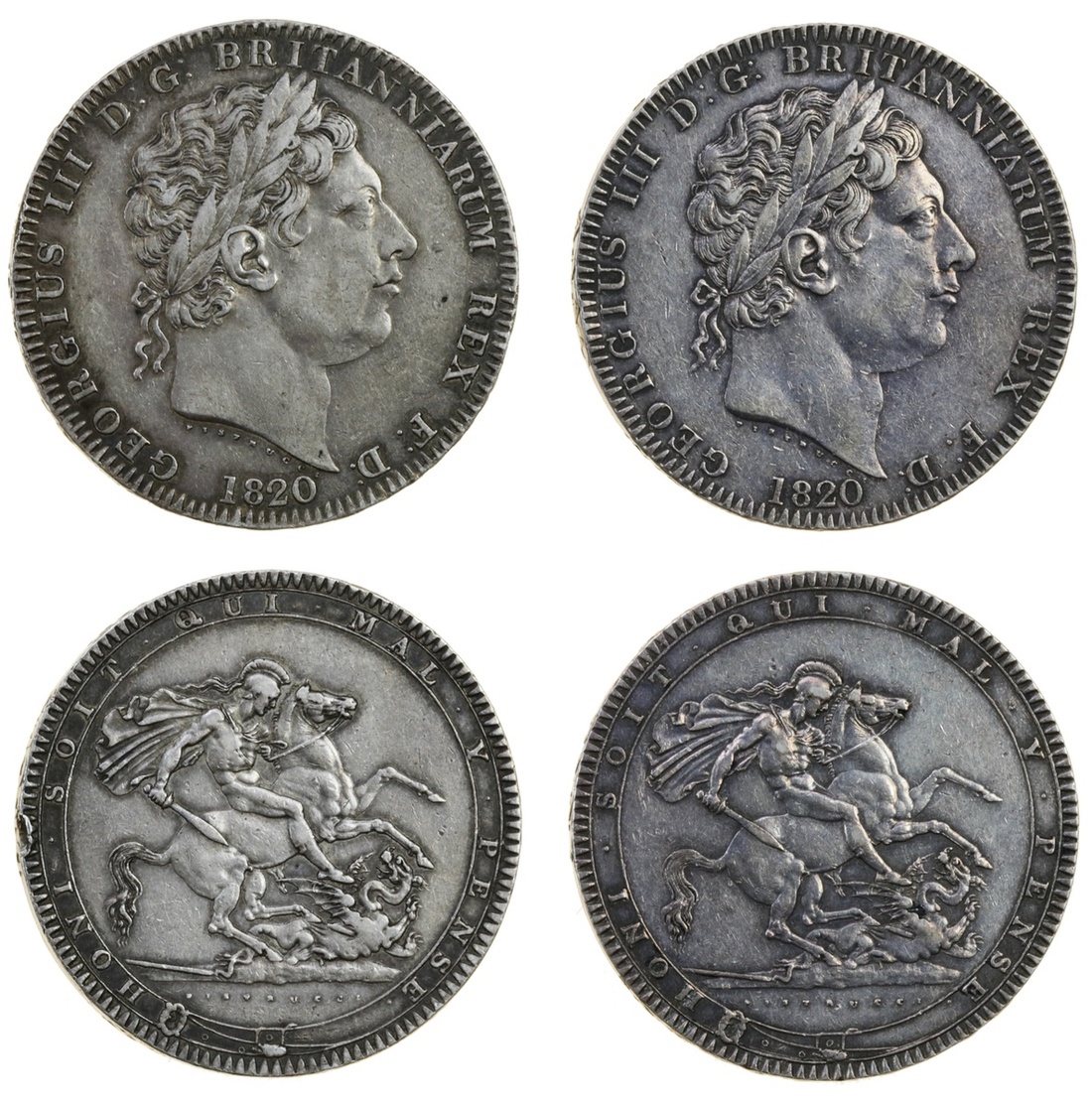 George III (1760-1820), Crowns, 1820 lx (2), laureate head right, rev. St. George and dragon (ESC 2016; S.3787), both very fine, the second with an edge knock on reverse at 9 o'clock (2)