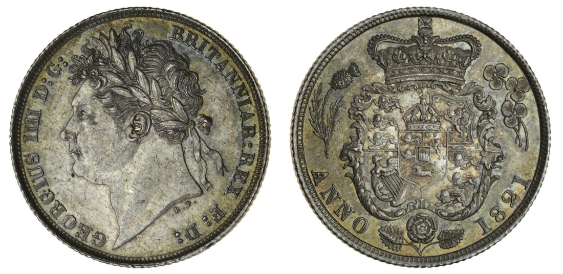 George IV (1820-30), Shilling, 1821, laureate head left, rev. crowned and garnished shield (ESC 2396; S.3810), a few light contact marks, otherwise about as struck, with a hint of rainbow tone