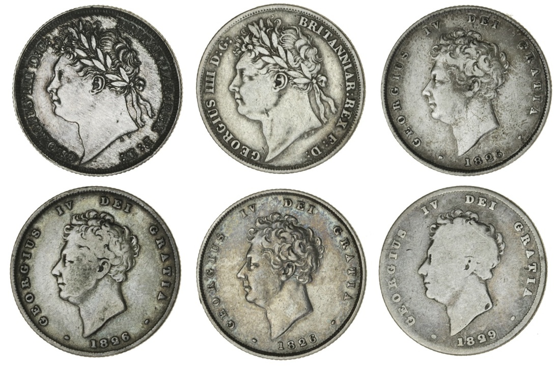 George IV (1820-30), Shillings (6), 1824, laureate head left, rev. crowned shield in garter (ESC 2400); 1825, similar (ESC 2402, S.3811); 1826 (3), bare head left, rev. lion atop shield (ESC 2409); 1829, similar (ESC 2413; S.3812), near fine to very fine (6)