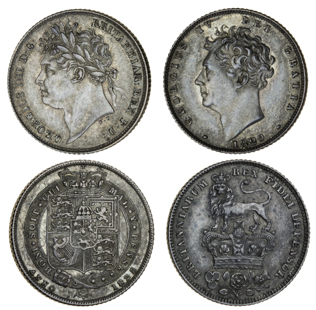 George IV (1820-30), Sixpences (2), 1825, laureate head left, rev. crowned shield in garter (ESC 2427; S.3814); 1829, bare head left, rev. lion atop crown (ESC 2439; S.3815), the first extremely fine, the second better (2)